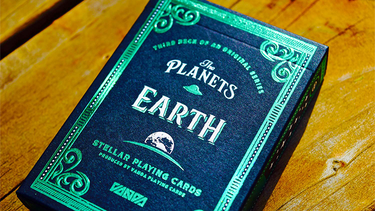 The Planets is a collection of decks representing the planets in our solar system. The series starts with planets closest to the sun, and then moves outwards into the surrounding universe. The third deck of this series is Earth, featuring our version of standard human courts. This is the most luxurious Vanda deck series to date, with tuckbox features that include green holographic foil, white foil, interior foiling, and embossing.